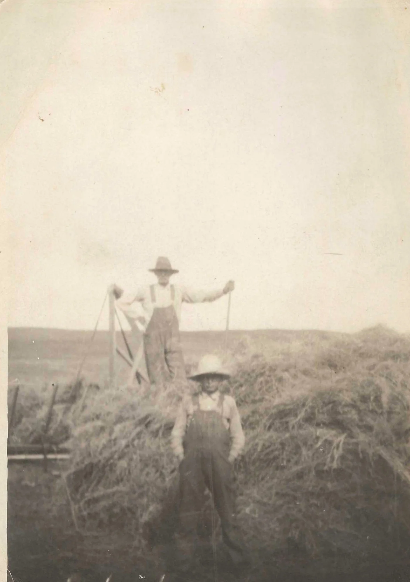 Louis Wiese (1st generation of Flying W Ranch) with whom would become his future father-in law Elmer Clemens stacking hay in Nebraska